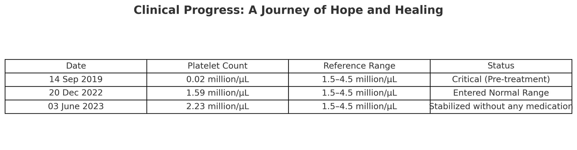 After more than two years of managing the condition with steroids and platelet transfusions, Ms. Mamtha reached out to us in December 2021. Her goal was to find a safer, more sustainable approach—one that would address the root cause, not just the symptoms.